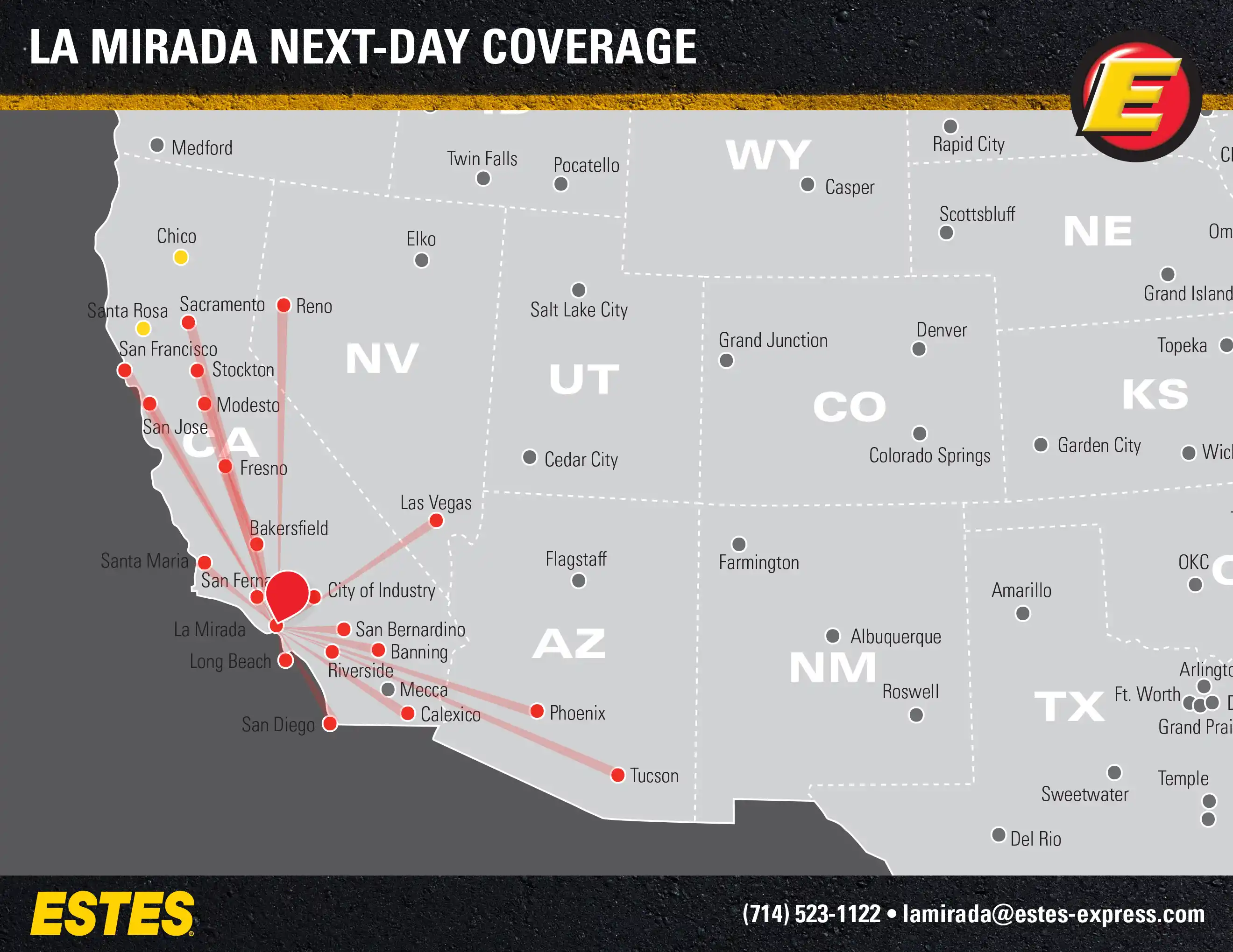 Estes offers next-day direct LTL freight shipping from the Anaheim-Irvine-Santa Ana area to Los Angeles, San Diego, San Francisco, Las Vegas, Phoenix, San Jose, Tucson, Sacramento, Fresno, Reno, Bakersfield, and Stockton, as well as next-day LTL to Santa Rosa, Chico, and more. Learn about the benefits of shipping through this hub terminal.